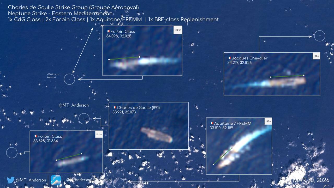 АУГ авианосца "Шарль де Голль" в районе Крита. Занимается прикрытием американских и британских баз в восточном Средиземноморье. Но большее Макрон пойти не готов.