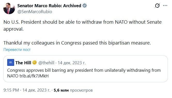 ‘Ни один президент США не должен иметь возможность выйти из НАТО без одобрения Сената. Благодарен своим коллегам в Конгрессе за принятие этого двухпартийного законопроекта’.