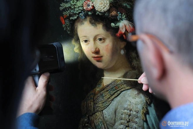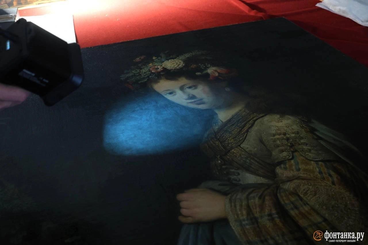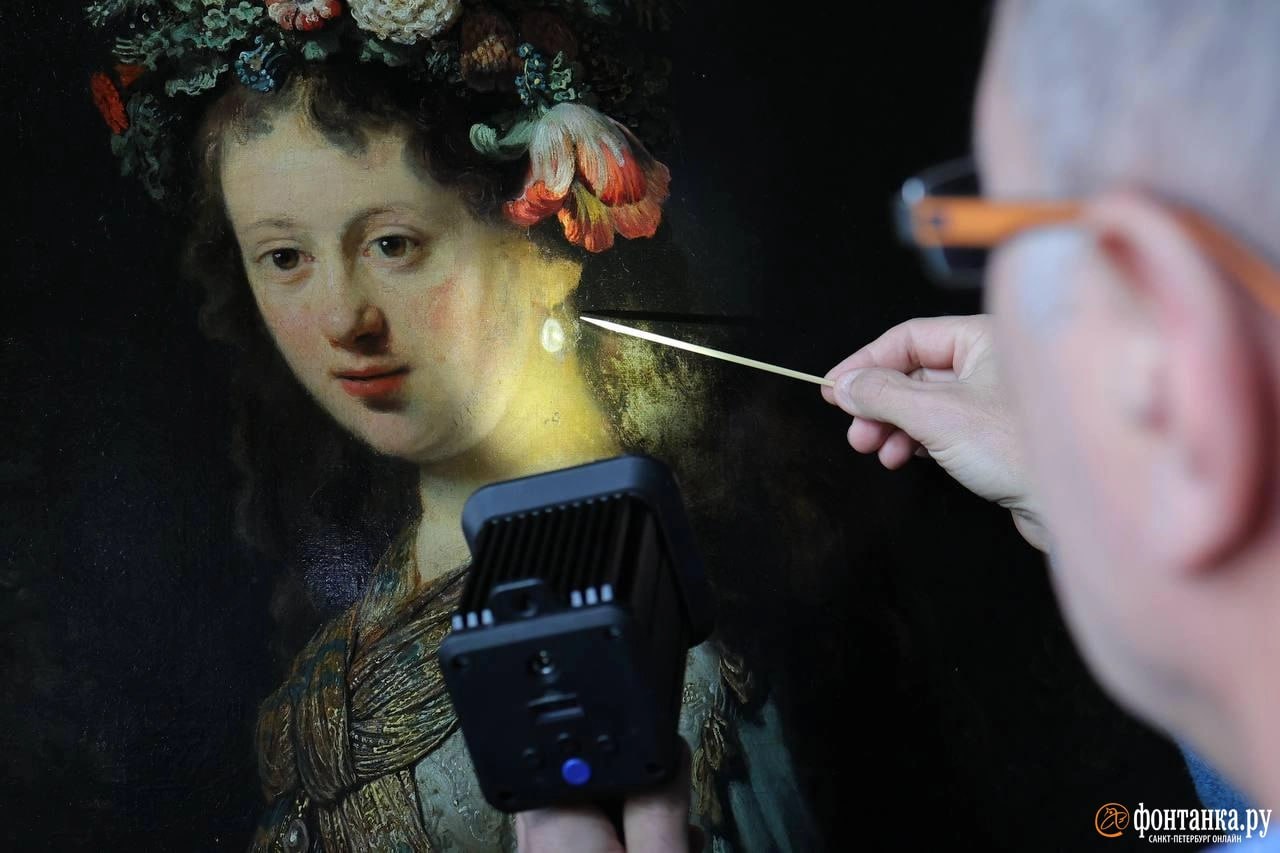 «Флору» Рембрандта из зала №254 Эрмитажа реставрируют с декабря 2025 года. За это время картина преобразилась: оказалось, что автор задумывал её более таинственной. Так, общий колорит картины стал холоднее, с тонким серебристым тоном, который за 400 лет жизни работы исчез. Это говорит о том, что художник писал не солнечный свет.