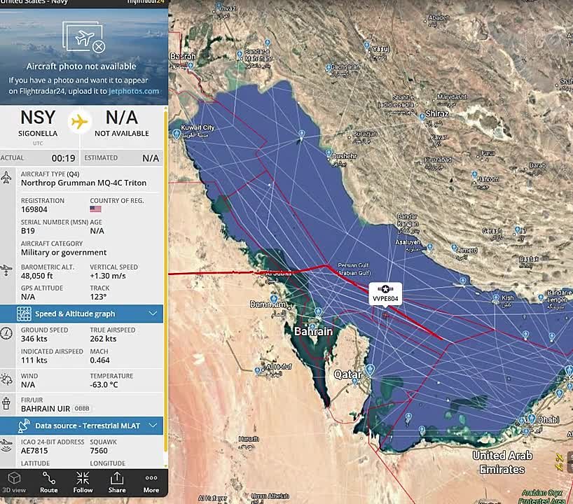 Крайне занятная аномалия. Американские высотные беспилотники Northrop Grumman MQ-4C Triton (которые, к слову, уже очень давно не появляются у берегов Крыма и Черноморского побережья Краснодарского края) сократили время боевого патрулирования у берегов Ирана. Раньше машины висели над Ормузом почти сутками, теперь — короткий разведывательный полёт и сразу домой. Интересно также, что аэродром базирования этих дронов на данный момент — Эль-Ваджх на западе Саудовской Аравии, а не базы вроде Аль-Удейд в Катаре или а/б Принц Султан в Саудовской Аравии (по крайней мере, сюда беспилотник может приземляться как минимум для дозаправки). С чем связана такая осторожность сказать сложно. Возможно, беспилотники этого типа просто берегут и стараются не допускать, чтобы КСИР их сбивали.