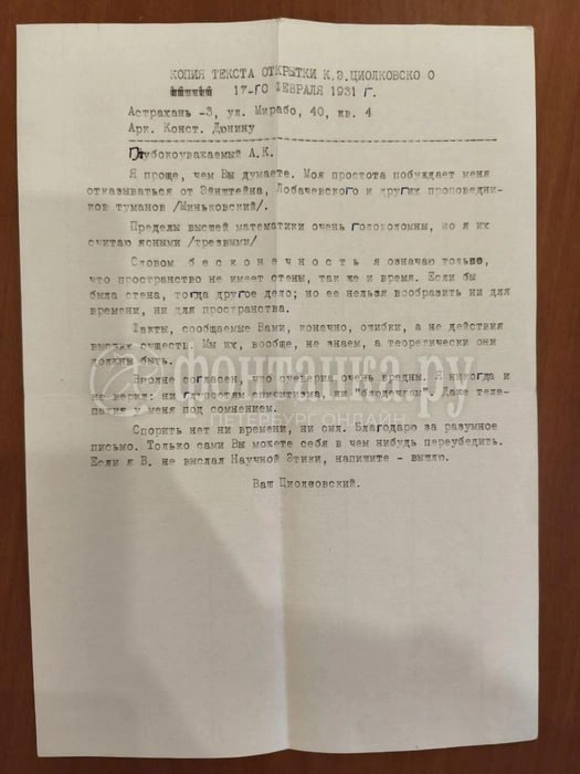 Письмо Константина Циолковского продадут в Петербурге. Написанное 17 февраля 1931 года на обратной стороне открытки письмо адресовано другу Циолковского по переписке Аркадию Дюнину (доктор технических наук и профессор).