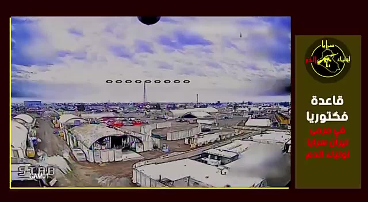 Полет дрона иракских прокси Ирана над базой "Виктория" в Багдаде. В конце FPV-дрон поражает емкости с горючим.