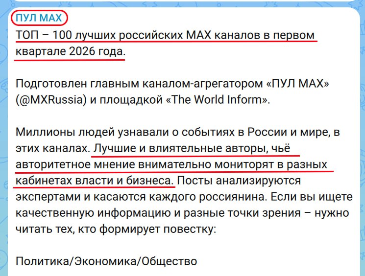 Друзья сбросили рейтинг каналов МАХ под громким названием «ТОП – 100 лучших российских MAX каналов в первом квартале 2026 года» с вопросом: «почему меня там нет»? На что я им ответил дословно – «да забей ты на них».