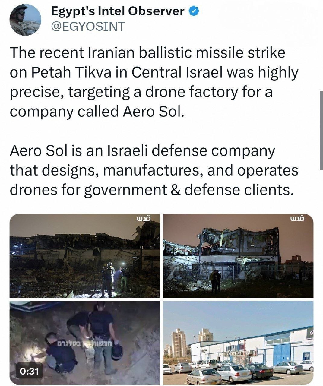 В результате вчерашнего ракетного удара Ирана по Петах-Тикве был поражен завод по производству беспилотников компании Aero-Sol.