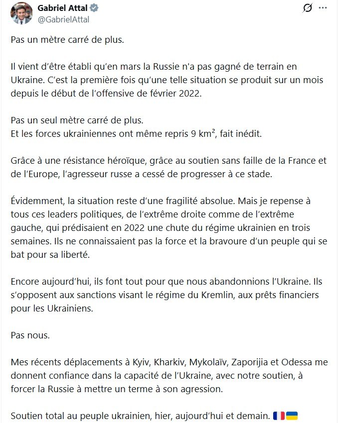 Благодаря непоколебимой поддержке Франции и Европы, на данном этапе наступление российского агрессора остановилось.'