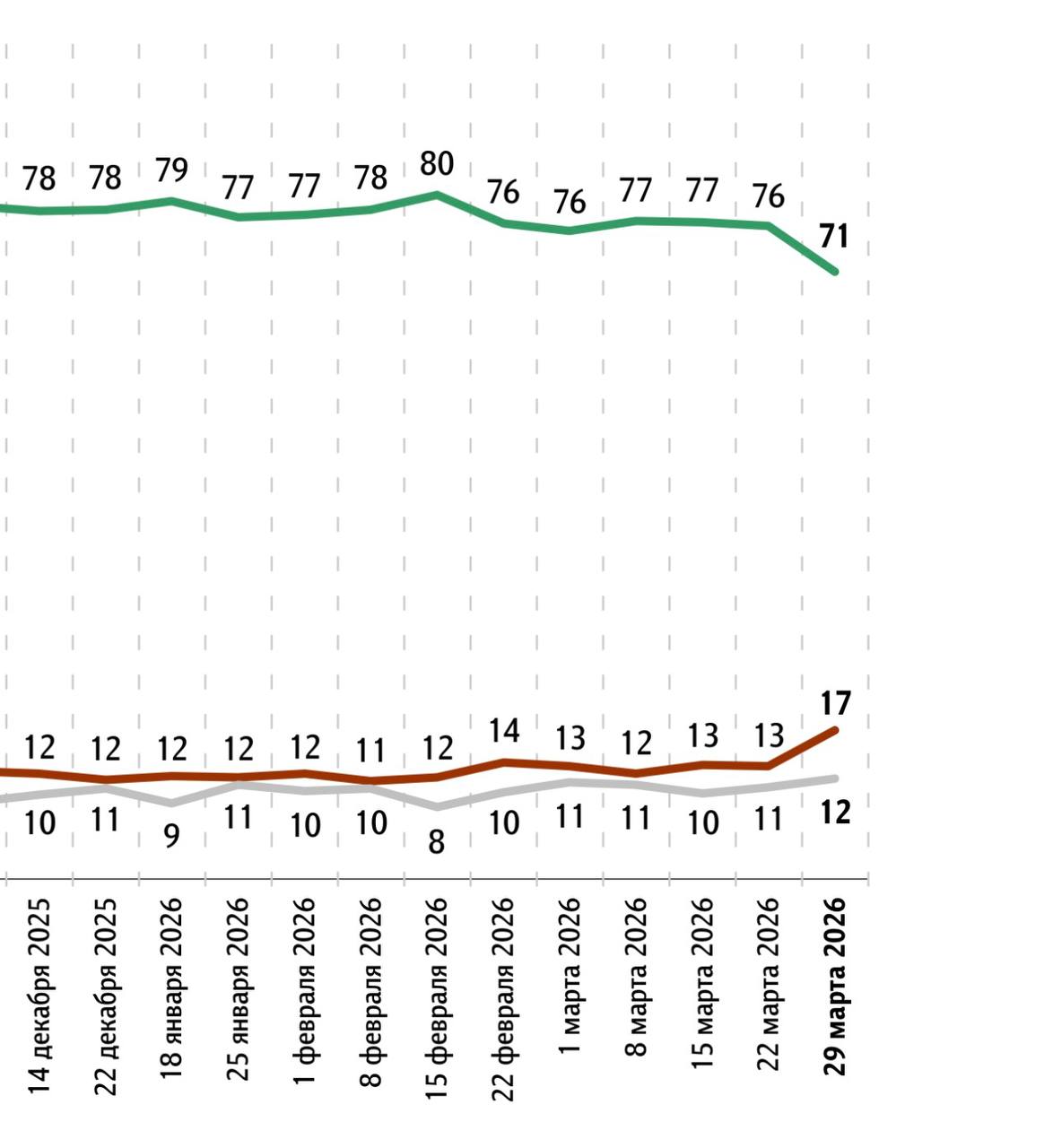 Количество россиян, заявляющих о доверии к президенту России Владимиру Путину, за прошлую неделю сократилось на 5 п. п. (с 76 до 71%), следует из данных соцопроса фонда «Общественное мнение», который был проведен 27-29 марта.Такого существенного падения доверия к президенту не фиксировалось фондом как минимум с 2019 года.