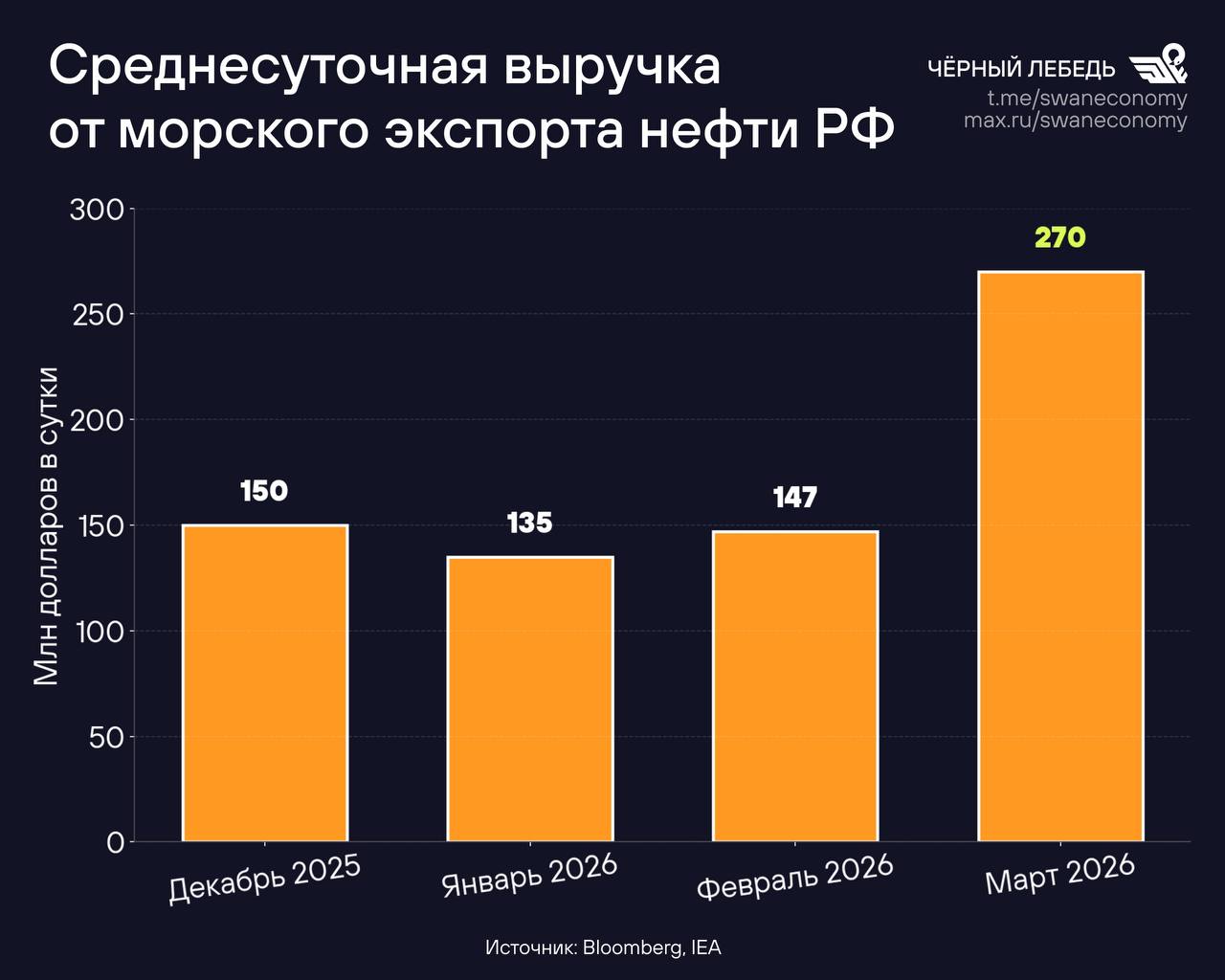 Одна неделя — не показатель. До неё, за три недели, экспорт нефти из РФ вышел на максимум за последние 4 года, что вынужден был признать Bloomberg. Пишут: в сутки — удвоение выручки, до 270 млн долларов по сравнению с январём.