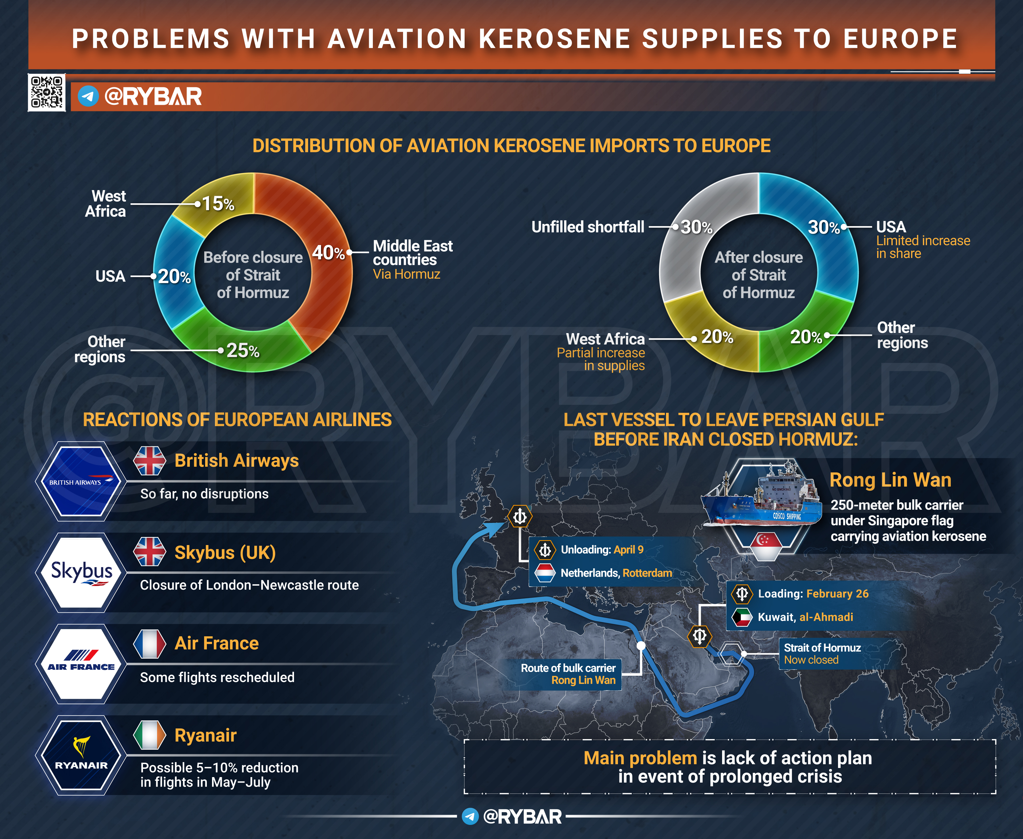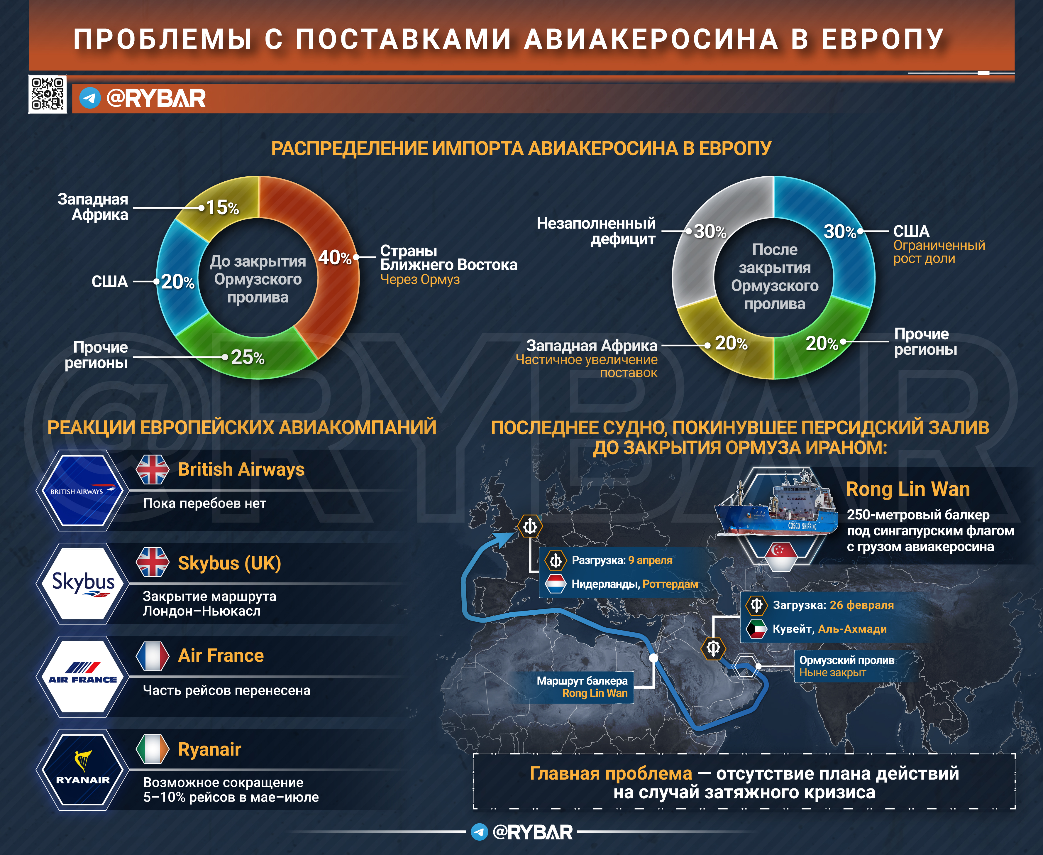 9 апреля в Роттердам прибудет танкер Rong Lin Wan — 250-метровый сингапурский балкер с грузом авиакеросина, отгруженного в кувейтском порту Mина-эль-Ахмади ещё 26 февраля. Это последнее судно, покинувшее Персидский залив до того, как Иран закрыл Ормузский пролив в ответ на удары США и Израиля.