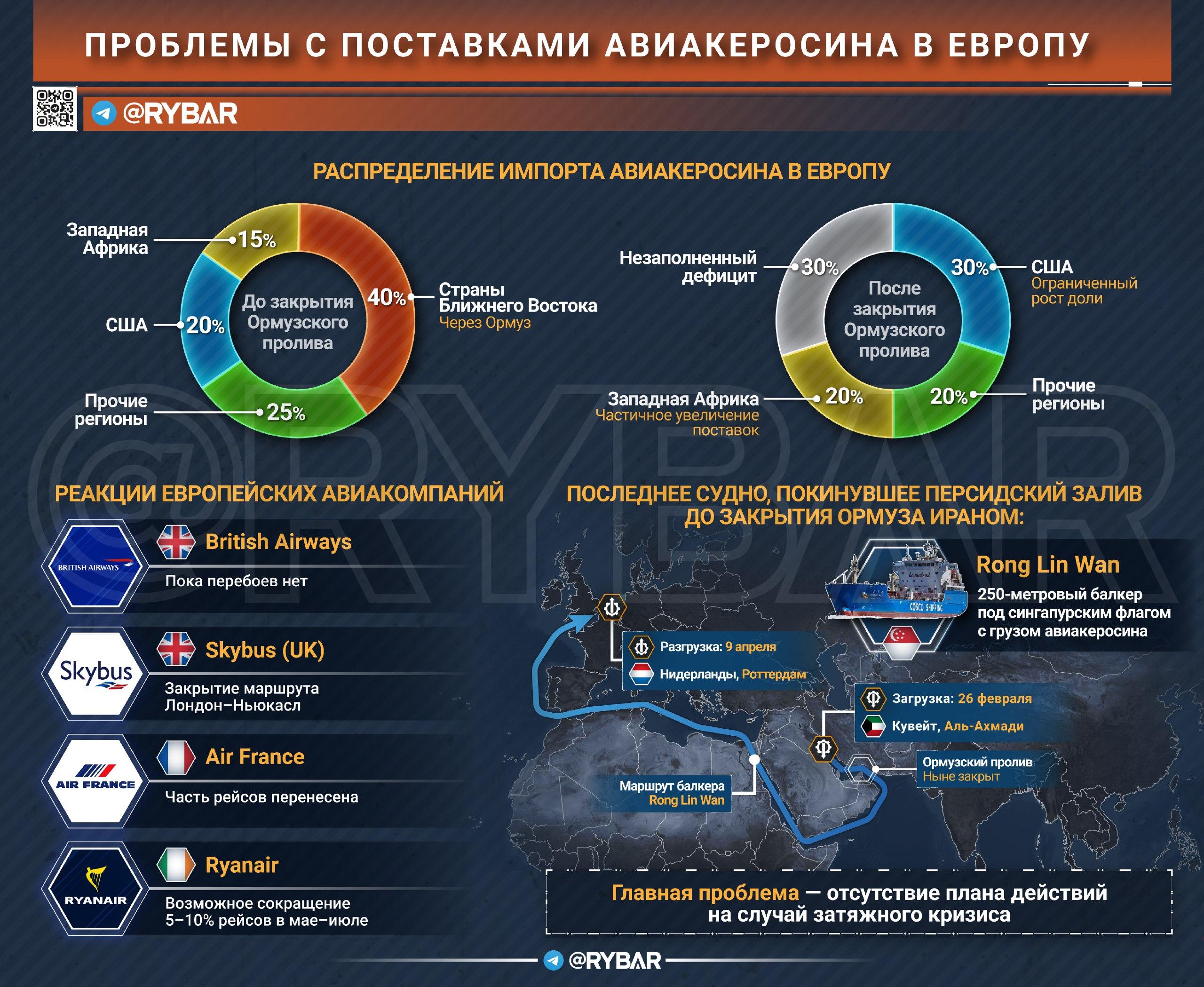 Ответ на вопрос «а почему бы не купить в другом месте» — красноречивый. США экспортируют в среднем 219 тыс. баррелей авиакеросина в сутки, тогда как только через Ормузский пролив ежедневно шло около 500 тыс. баррелей. В американской администрации заявили, что «у нас всего достаточно» — но это арифметически невозможно.