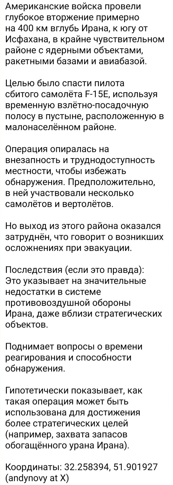 Это я к чему - за хиханьками хаханьками, огромное число наших СМИ, ЛОМов, не видят простой истины - что залететь в глубь вражеской территории на 400 км, провести там операцию по развертыванию временного аэродрома подскока, организовать с воздуха изоляцию района поиска чтоб группы спецназа КСИР, ополчения не смогли захватить летчиков - это технически просто нереально сложная операция.