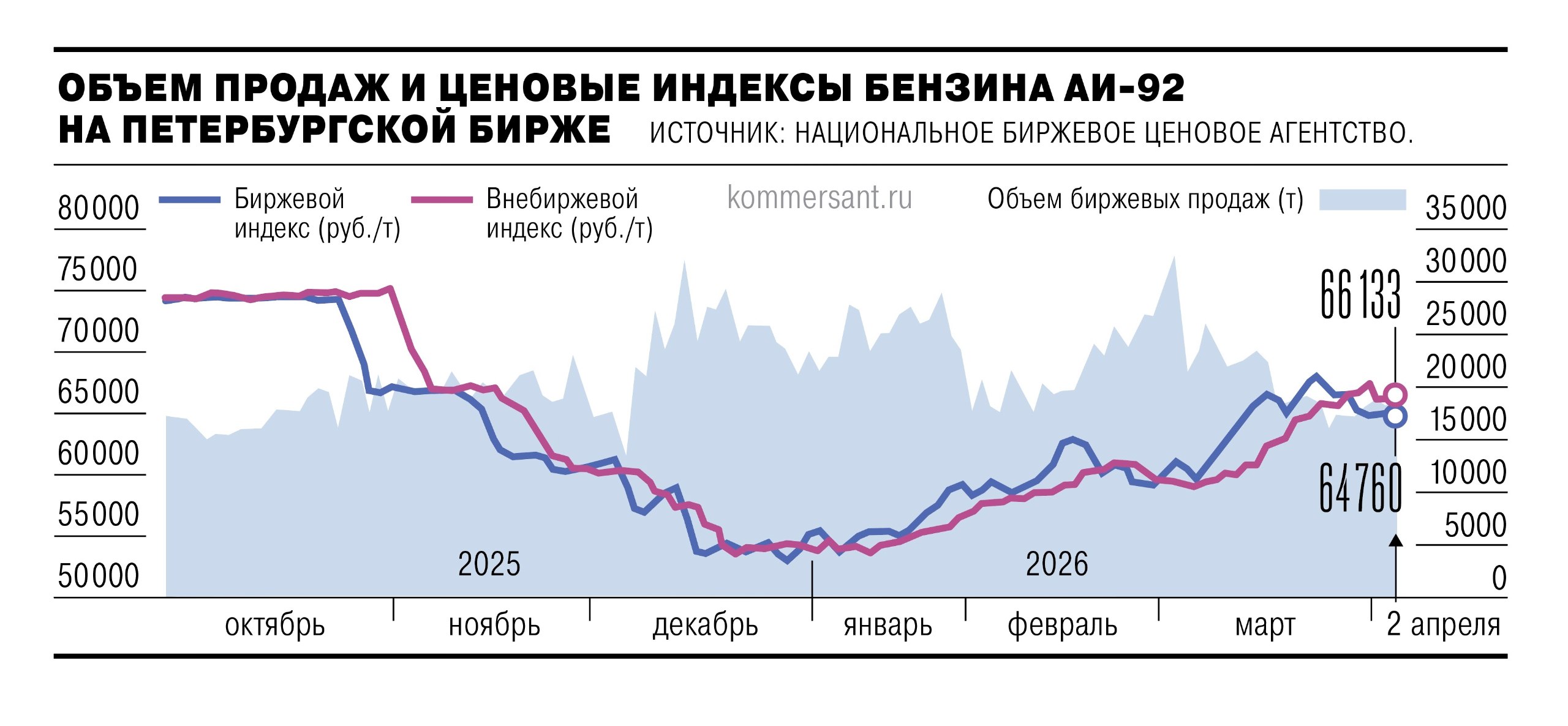 Продажи бензина на Петербургской бирже с отгрузкой с предприятий по итогам марта сократились на 8%. Хотя введенный с 1 апреля запрет на экспорт обещает высвободить для внутреннего рынка 6–7 тыс. тонн топлива в сутки, аналитики считают, что этот объем нивелируется простоями НПЗ.