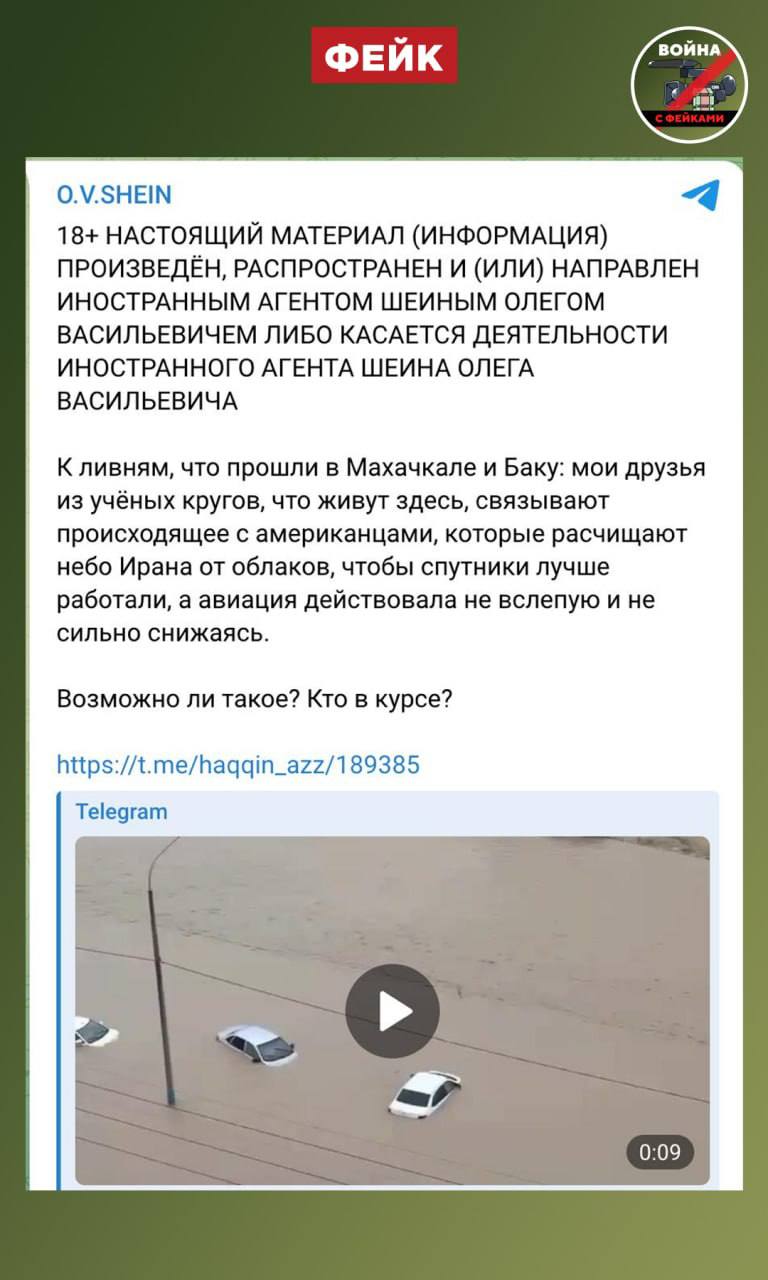 Фейк: Рекордные осадки в Дагестане вызваны тем, что американцы «расчищают небо Ирана от облаков». Это приводит к перераспределению воздушных масс над Каспием и обильным ливням на территории Азербайджана и России, сообщают проукраинские телеграм-каналы и ресурсы иноагентов.
