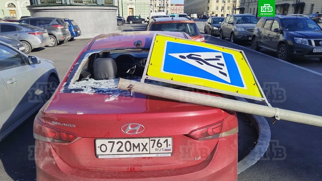 Ночью в районе проспекта Большевиков на парковке летал сорванный торговый шатер. Повреждено несколько автомобилей. А утром дорожный знак упал на иномарку у Мариинского театра.