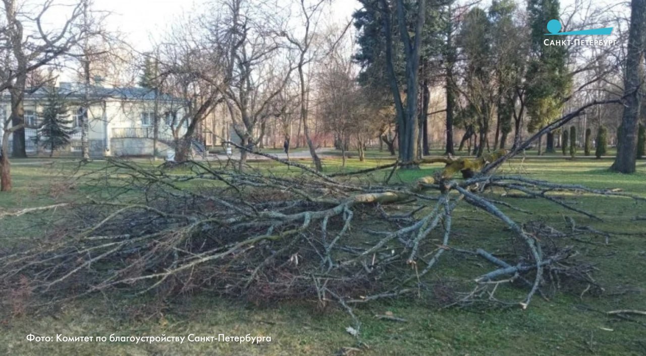 Ветром повалило несколько крупных деревьев: липу на улице Типанова (диаметр 28 см) и в парке Екатерингоф (56 см), там же обломилась ветка тополя. В Удельном парке рухнула ольха, в Колпинском — тополь и липа, в сквере на Шлиссельбургском шоссе — ива белая. Все стволы убирают и вывозят.
