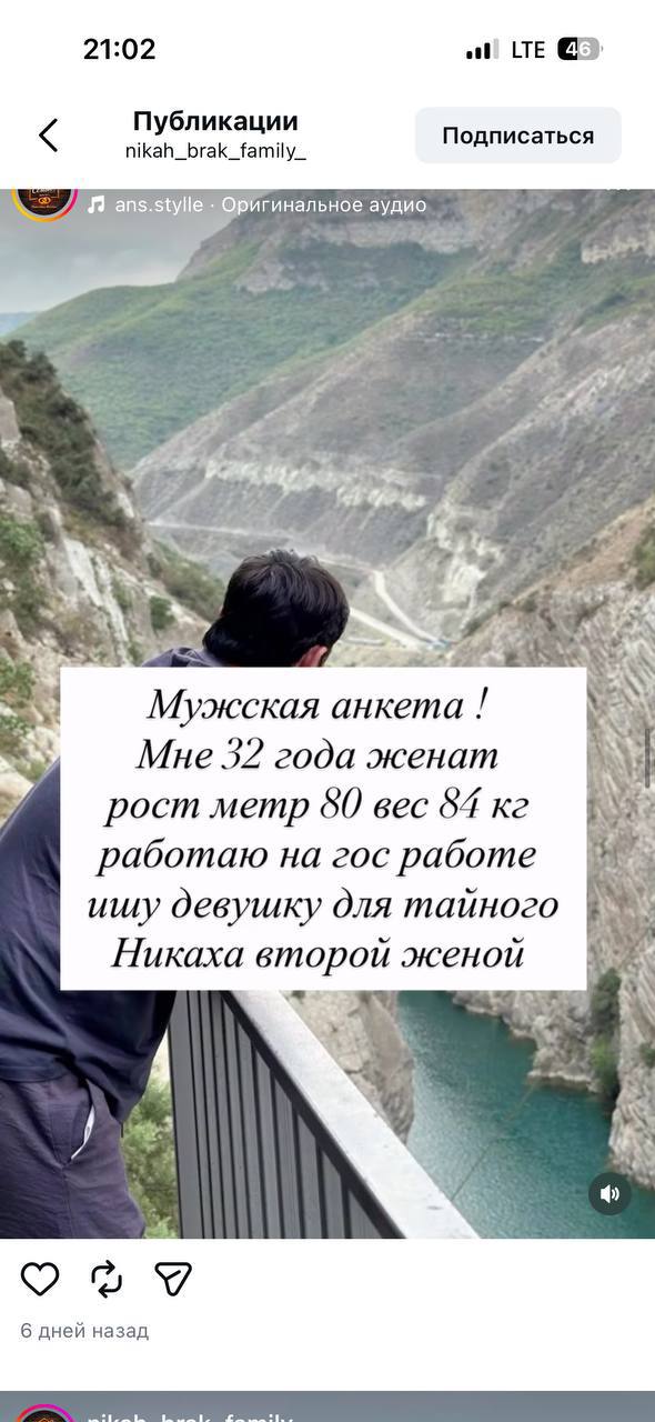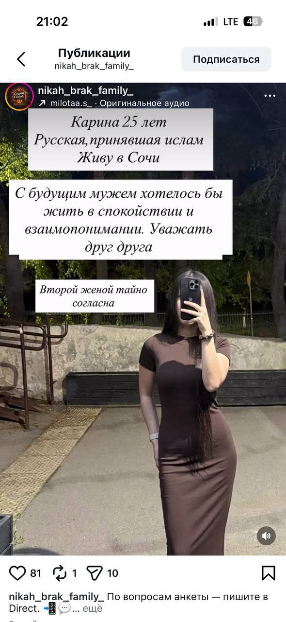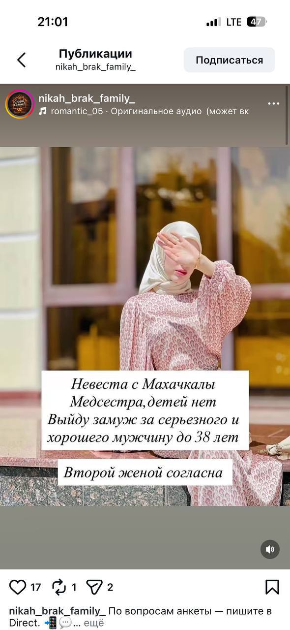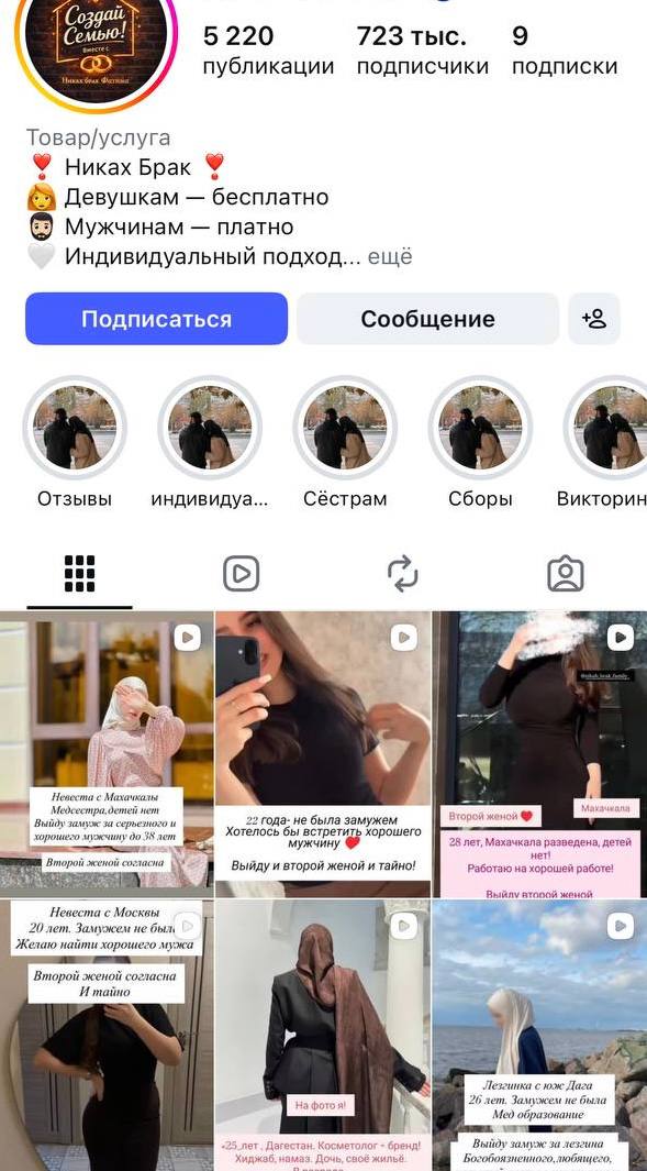 В запрещённых соцсетях создаются группы, выполняющие роль «сводников». Как правило, девушки размещают объявления бесплатно, мужчины платят за право найти партнёршу. Назвать претенденток невестами язык не поворачивается. Многие из них указывают, что согласны «быть второй женой» и совершить «тайный никах».