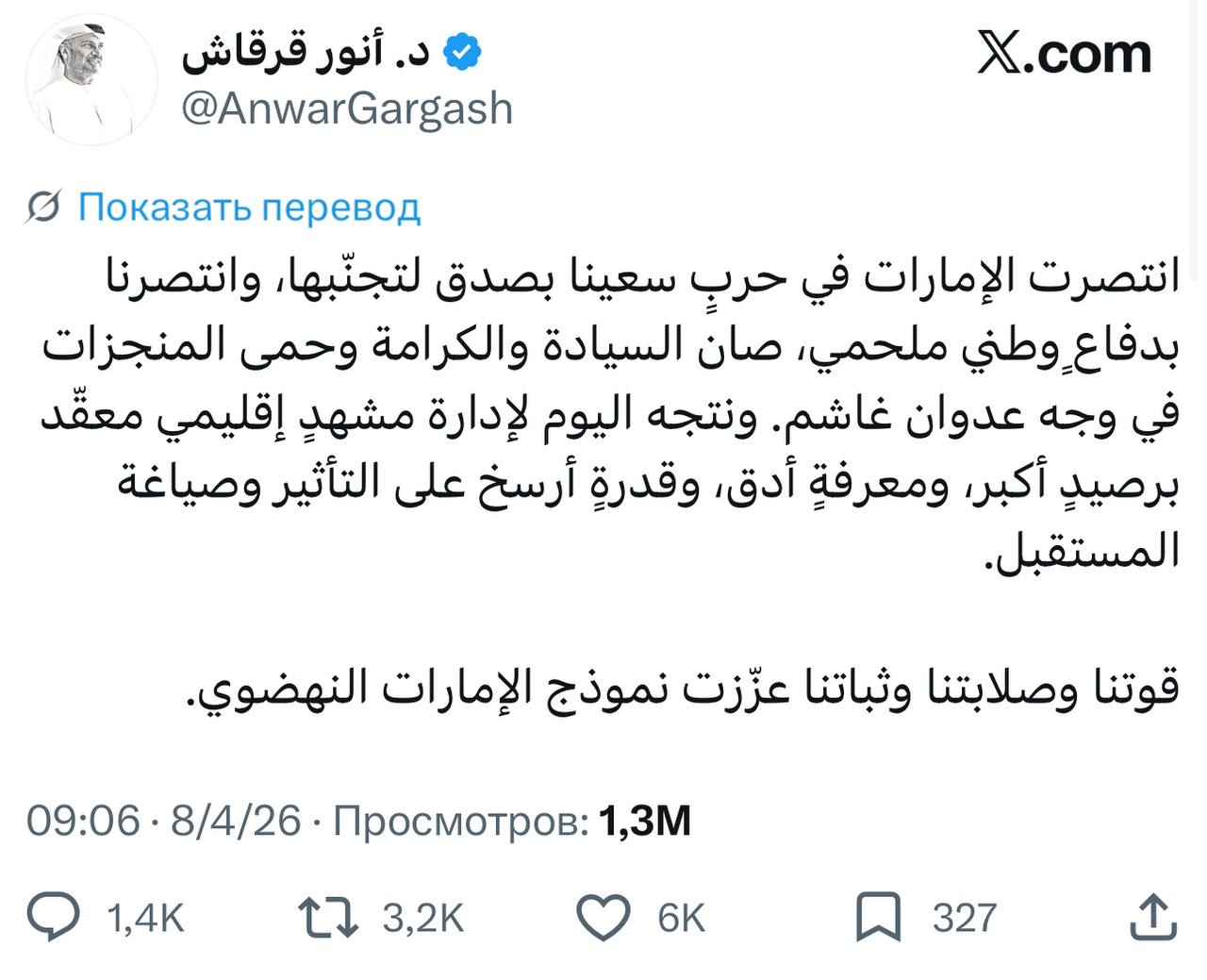 «ОАЭ одержали победу в войне, которой мы искренне стремились избежать, и мы победили в эпической национальной обороне…», — Советник президента ОАЭ по дипломатическим вопросам Анвар Гаргаш.