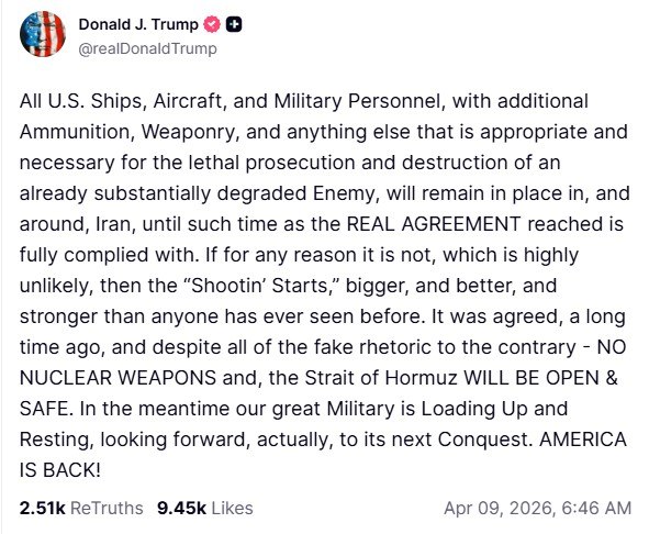 ‘Все корабли, самолёты и военнослужащие США, а также дополнительные боеприпасы, вооружение и всё остальное, что является уместным и необходимым для смертоносного ведения боевых действий и уничтожения уже значительно ослабленного противника, будут оставаться на местах в Иране и вокруг него до тех пор, пока ДОСТИГНУТОЕ РЕАЛЬНОЕ СОГЛАШЕНИЕ не будет полностью выполнено.