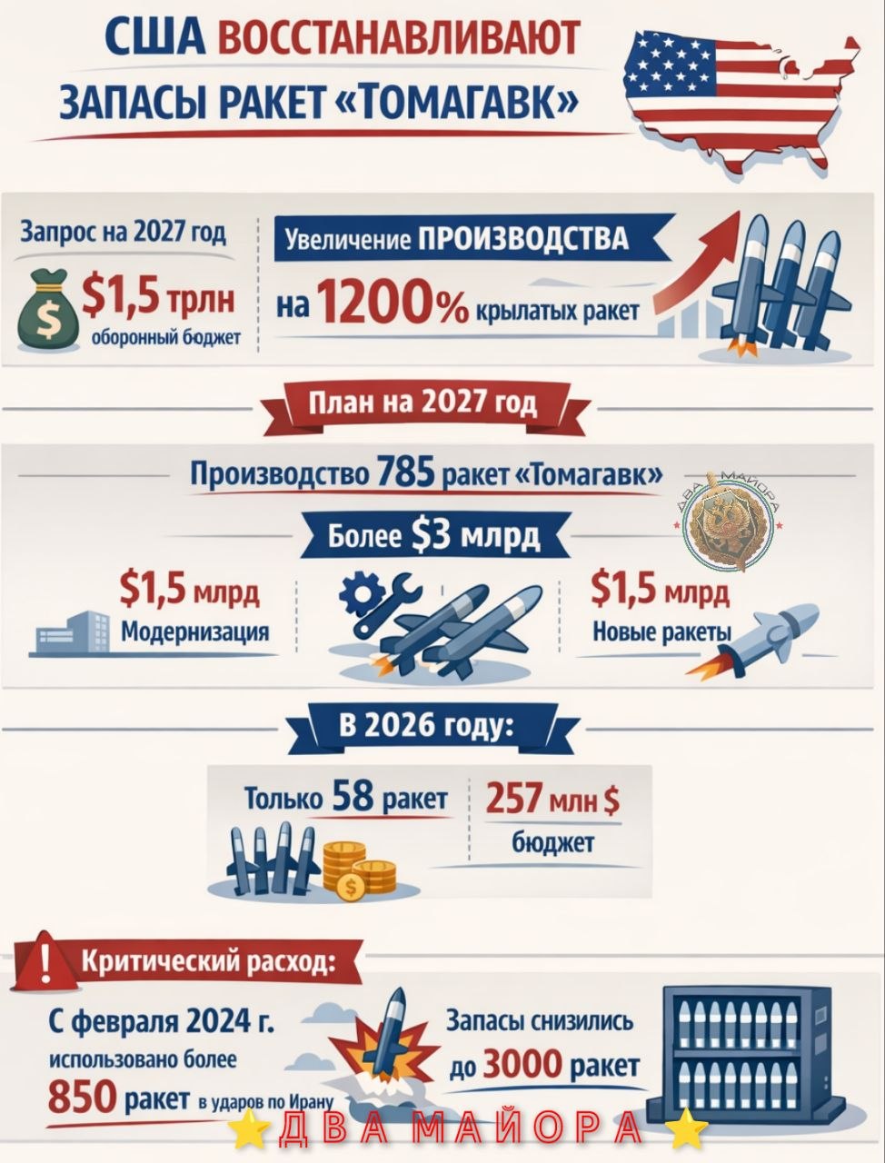 В рамках бюджетного запроса в оборонный бюджет на 2027 год (всего 1,5 триллиона долларов), ВМС США запросили увеличение на 1200% количества ракет большой дальности.
