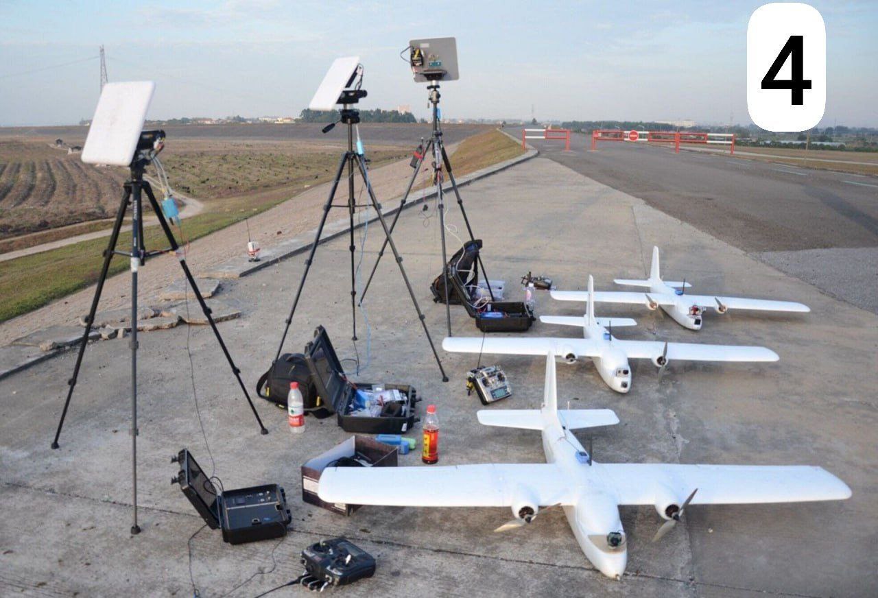 На четвертом слайде - БПЛА самолётного типа, управляемый по принципу FPV. То есть оператор его ведет постоянно. Если попадает в зону РЭБ - "спит", не падает, выныривает из зоны РЭБ и вновь оператор ведет БПЛА. За счет того, что все-таки это "крыло", дальность применения у него выше, чем у дронов коптерного типа. Есть и "камикадзе", и оборудованные сбросами.