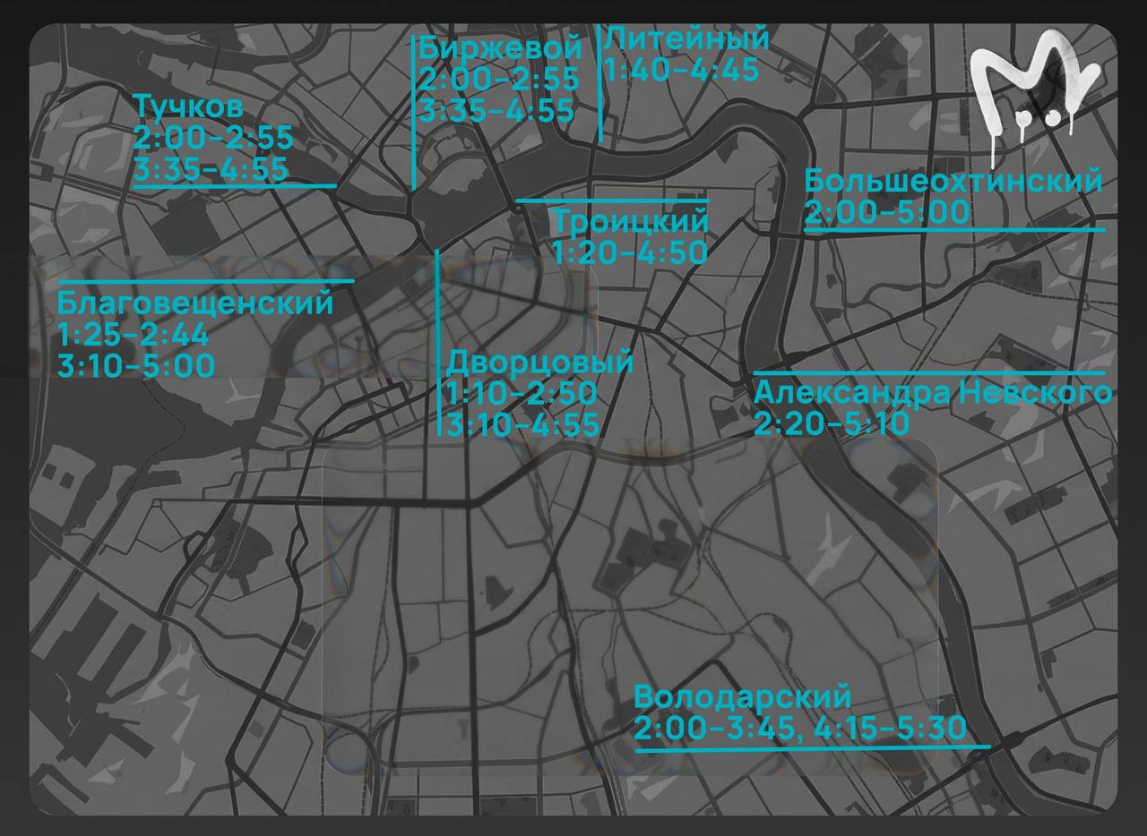 Самый главный признак весны в Питере — начало разводки мостов. Уже в эту ночь и далее постоянно. Вспоминаем, запоминаем график — на наших карточках.