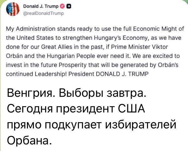 Трамп: «Моя администрация готова использовать всю экономическую мощь Соединенных Штатов для укрепления экономики Венгрии, как мы это делали для наших великих союзников в прошлом, если премьер-министру Виктору Орбану и венгерскому народу это когда-нибудь понадобится. Мы рады инвестировать в будущее процветание, которое будет создано благодаря продолжению руководства Орбана!».