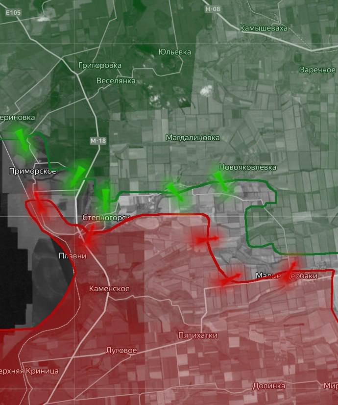«На Запорожском направлении продолжаются боестолкновения в Степногорске и Приморском. Силы обороны пытаются выйти на рубеж Каменское - Степовое - Малые Щербаки.