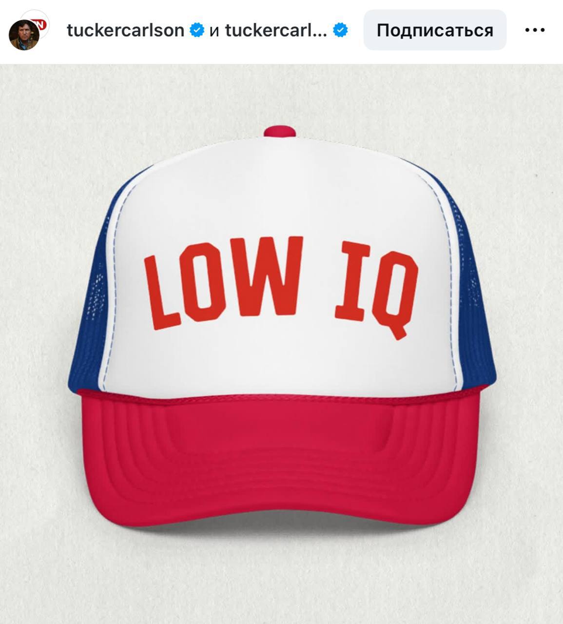 Ну и лучший контрудар — взять чужое оскорбление и продать его за $35. Такер Карлсон выпустил коллекцию кепок с обзывательством «низкий IQ», которым наградил его Дональд Трамп.
