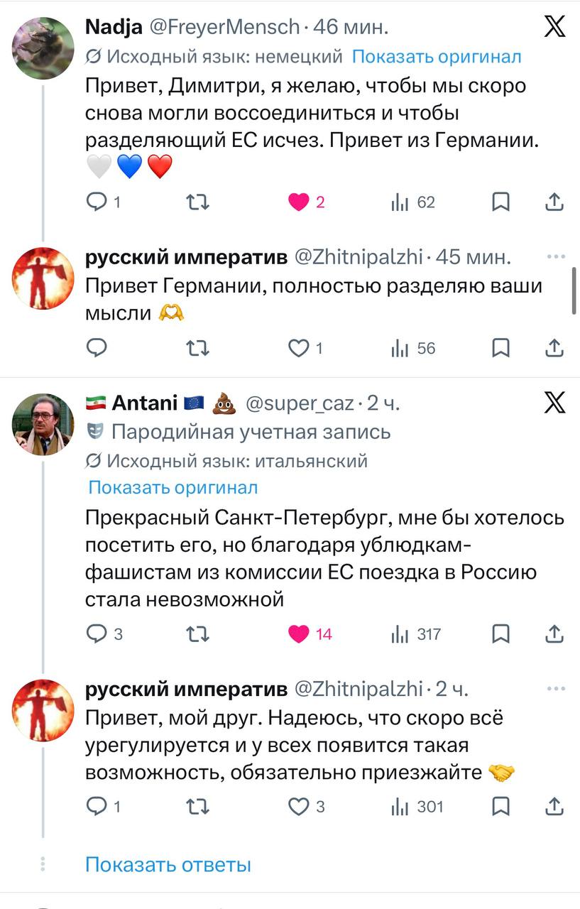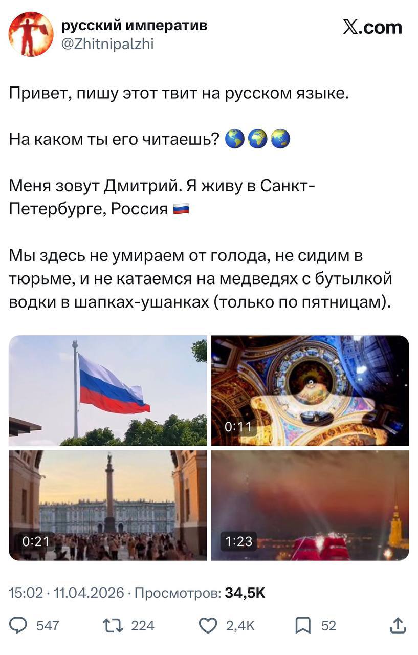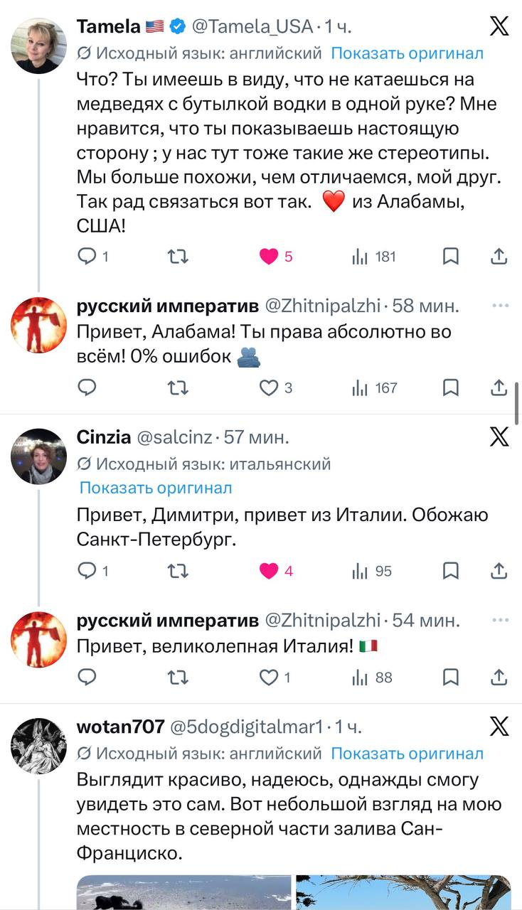 Каждые 5 секунд прилетают приветы и тёплые слова о России, одуревшие от пропаганды люди удивляются тому, что у нас тоже 2 ноги и мы тут все не сидим в тюрьме, в которой из украинского асфальта собираем танки и ракеты.