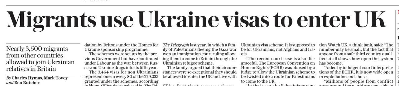 Около 3,5 тысяч мигрантов (точное число - 3464) из 112 стран (включая Афганистан, Нигерию, Ирак, Иран, Индию и… Россию) въехали на территорию Британии, используя схему приема украинских беженцев. Об этом сообщает сегодня газета The Sunday Telegraph. Въезжают они под видом «родственников украинских беженцев».