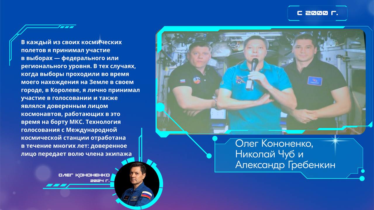 А на выборах Президента в 2024 году трое российских космонавтов — Олег Кононенко, Николай Чуб и Александр Гребенкин — снова проголосовали через доверенных лиц, следуя традиционной процедуре.
