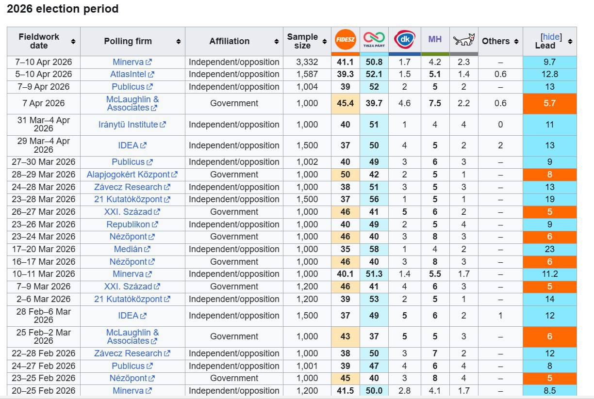 По опросам победу «Тисе» (на картинке отмечена синим) отдают только соцслужбы аффилированные с оппозицией, тогда как соцслужбы аффилированные с властью отдают победу партии Орбана Фидес (на картинке отмечена красным) с преимуществом не менее 5%.