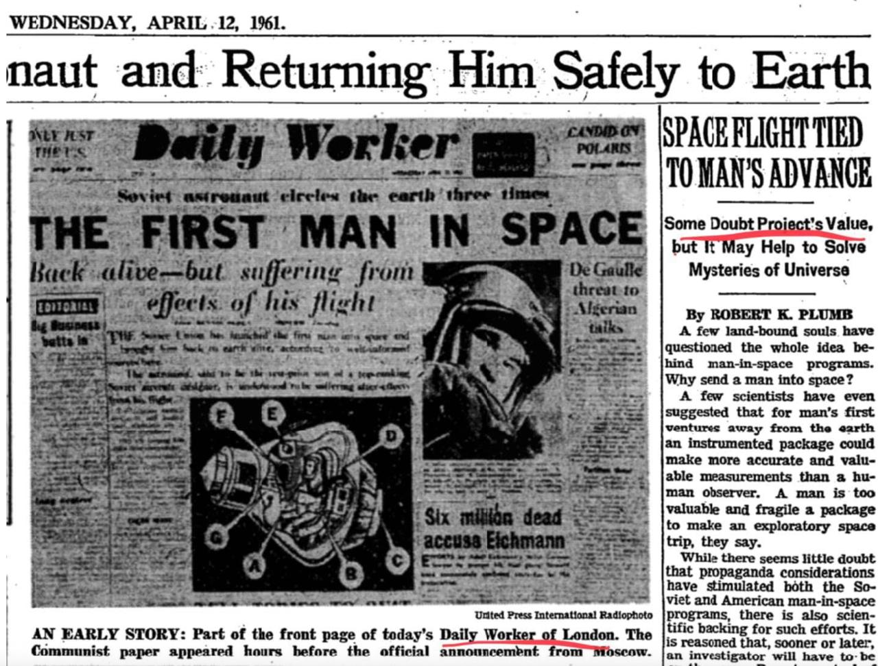 65 лет назад мировая пресса славила нашего космонавта. И только New York Times оставалась верна себе, сообщив читателям «главные» новости: выразив «сомнения в ценности проекта» и указав на то, что первой в мире (даже якобы до официального объявления в СССР) о полете Гагарина сообщила газета британских коммунистов Daily Worker.