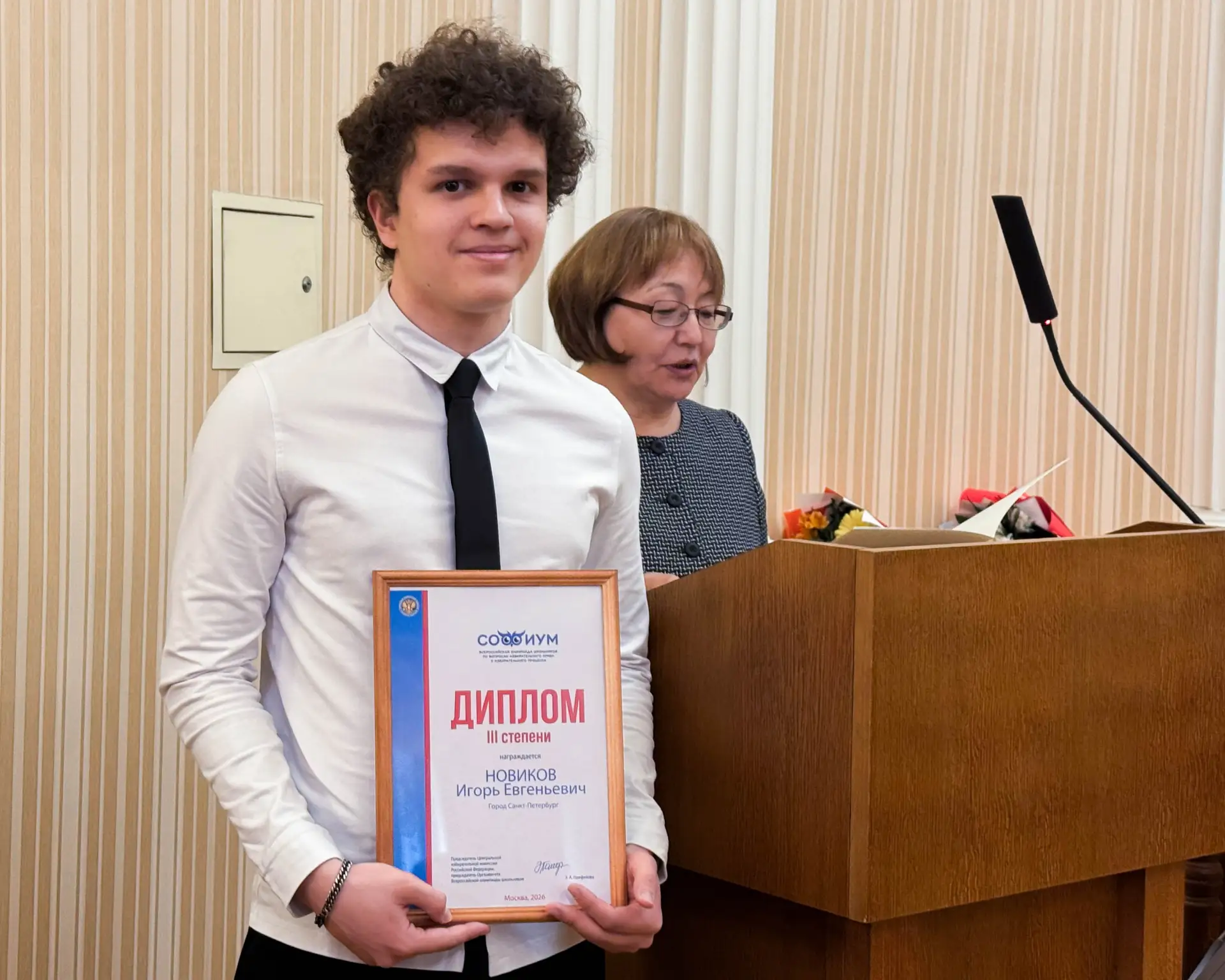 Ученик 10 класса школы №604 имени Н.С. Майданова Игорь Новиков успешно выступил на заключительном этапе олимпиады, прошедшем в Центральной избирательной комиссии России. По итогам Олимпиады он стал призером III степени, достойно представив Санкт-Петербург. Награду в торжественной обстановке вручила член Санкт-Петербургской избирательной комиссии Екатерина Фесик.
