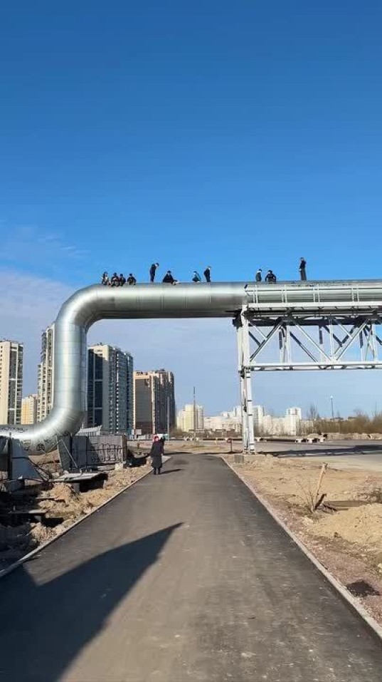 На еще закрытом участке Шуваловского проспекта подростки ходят по перекинутой над дорогой теплотрассой. А еще висят вниз головой или просто сидят на ней.