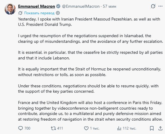 ‘Вчера я поговорил с президентом Ирана Пезешкианом и президентом США Трампом. Я призвал к возобновлению переговоров, приостановленных в Исламабаде, прояснению недопониманий и недопущению дальнейшей эскалации. Крайне важно, в частности, чтобы режим прекращения огня строго соблюдался всеми сторонами, и чтобы он распространялся на Ливан. Не менее важно, чтобы Ормузский пролив был как можно скорее открыт без каких-либо условий, ограничений или сборов’.
