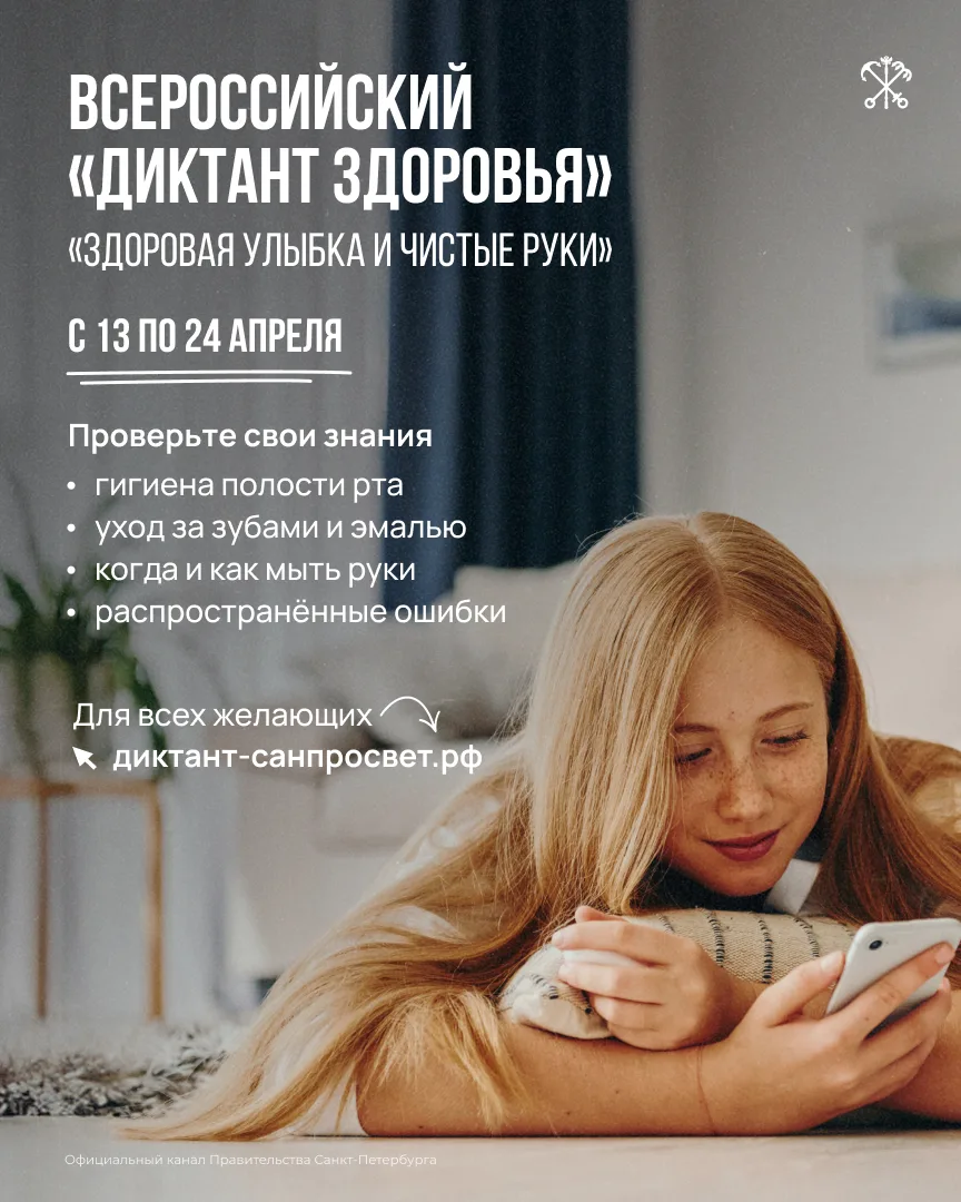 Это онлайн-диктант о базовых правилах личной гигиены. Вопросы посвятят двум темам, которые напрямую связаны с профилактикой заболеваний, — гигиене полости рта и чистоте рук. Участники смогут проверить свои знания и получить пояснения экспертов.