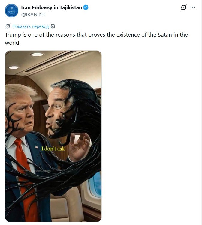 Посольство Ирана в Таджикистане объясняет действия Трампа тем, что в него вселился Веном-Эпштейн.