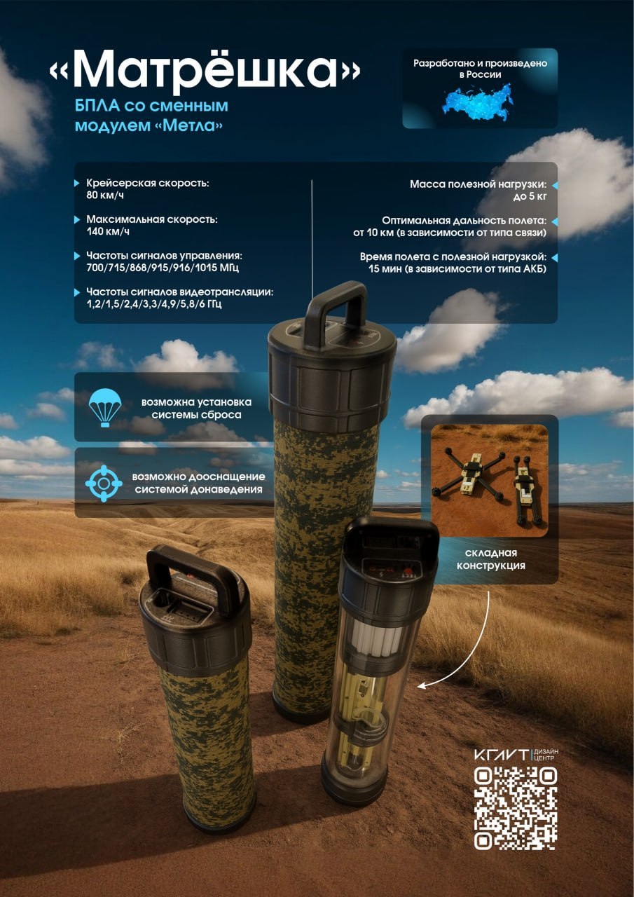 Сам дрон имеет универсальный разъём, позволяющий быстро менять модули связи или подключать катушку с оптоволокном — в зависимости от задачи. В боеготовое состояние «Матрёшка» приводится за считанные минуты.