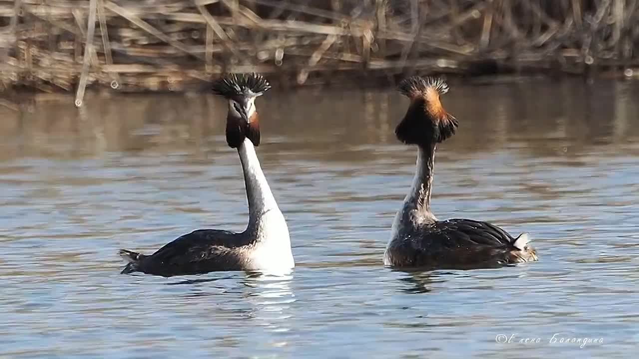 Брачный танец чомг запечатлели на Долгом озере. Птицы плывут навстречу друг другу, распушают перья воротника, крутят головами и сближаются. В этот момент оба партнера могут преподносить подарки – добытые со дна пучки водорослей.