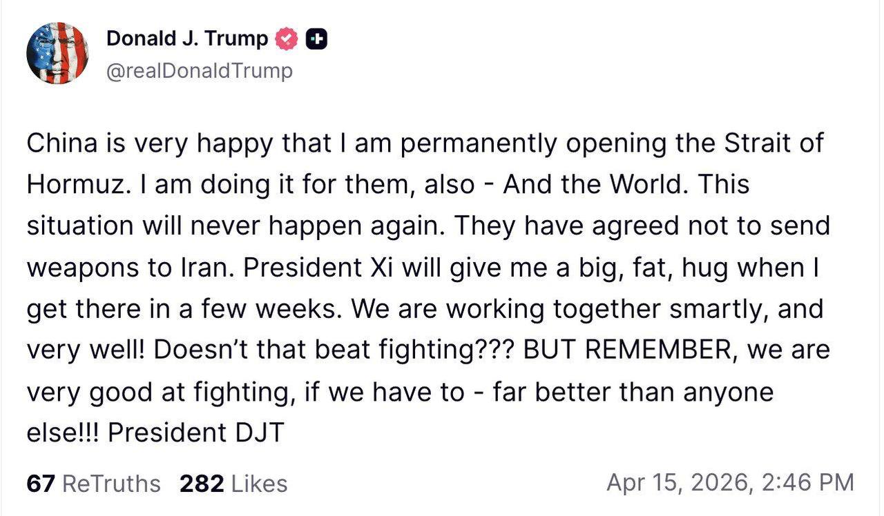 «Китай очень рад, что я навсегда открываю Ормузский пролив. Я делаю это и для них, и для всего мира. Президент Си Цзиньпин крепко обнимет меня, когда я приеду туда через несколько недель».