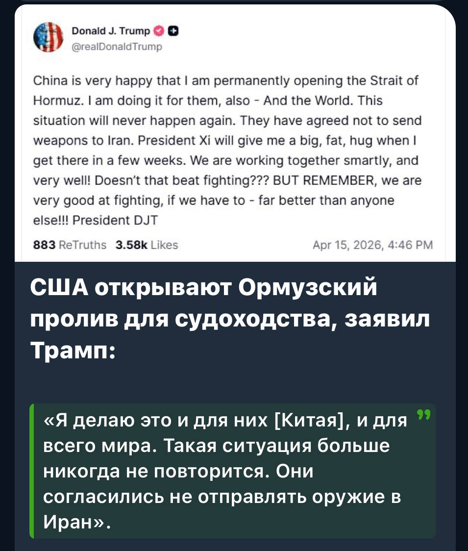 Ну в общем, с блокадой у Трампа вышел обсер. Пустое бахвальство никого не впечатлило; Иран и Китай на блокаду Ормузского пролива просто забили, проводку своих танкеров продолжили — и Трамп предсказуемо сдал назад.