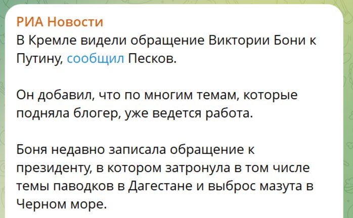 Пресс-секретарь президента России Дмитрий Песков сообщил, что в Кремле видели обращение блогера Виктории Бони к Владимиру Путину.