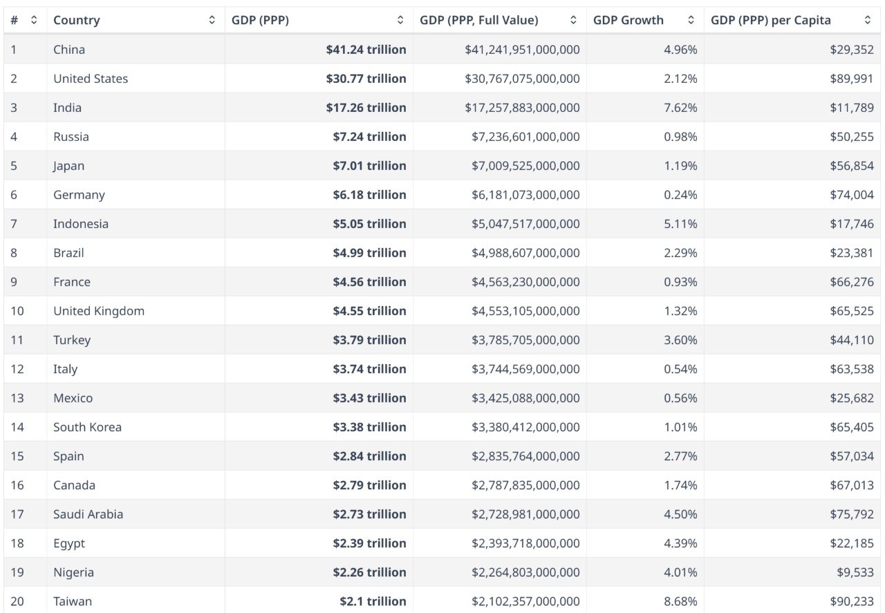 Страна сохранила четвертое место в мировом рейтинге. Лидером осталась Китай с 41,2 трлн долларов (рост с 38,2 трлн). На втором месте — США (30,8 трлн против 29,3 трлн), на третьем — Индия (17,3 трлн против 15,6 трлн). Пятёрку замыкает Япония с 7 трлн долларов.