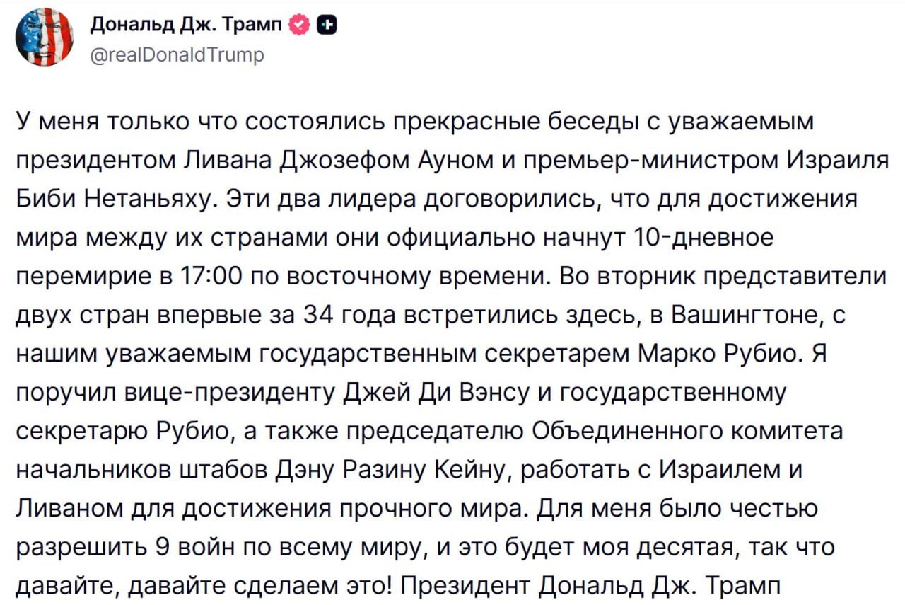 Трамп объявил о 10-дневном перемирии между Ливаном и Израилем, и приписал себе десятую победу