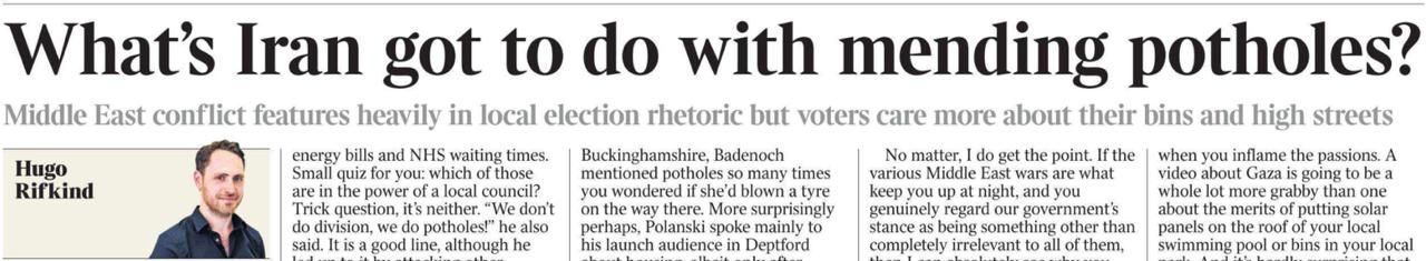 «Какое отношение Иран имеет к заделыванию дорожных ям?» Под таким заголовком колумнист The Times Хьюго Рифкинд сегодня пишет о том же, о чем я на днях написал в своей колонке о локальных выборах в Англии.