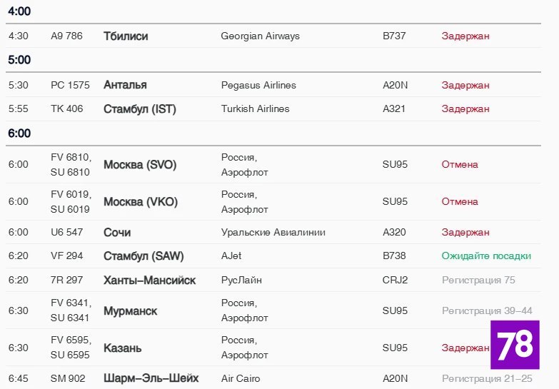 Как стало известно , самолеты, которые должны были отправиться в Тбилиси, Анталью, Стамбул, Сочи и Казань в данный момент задержаны.