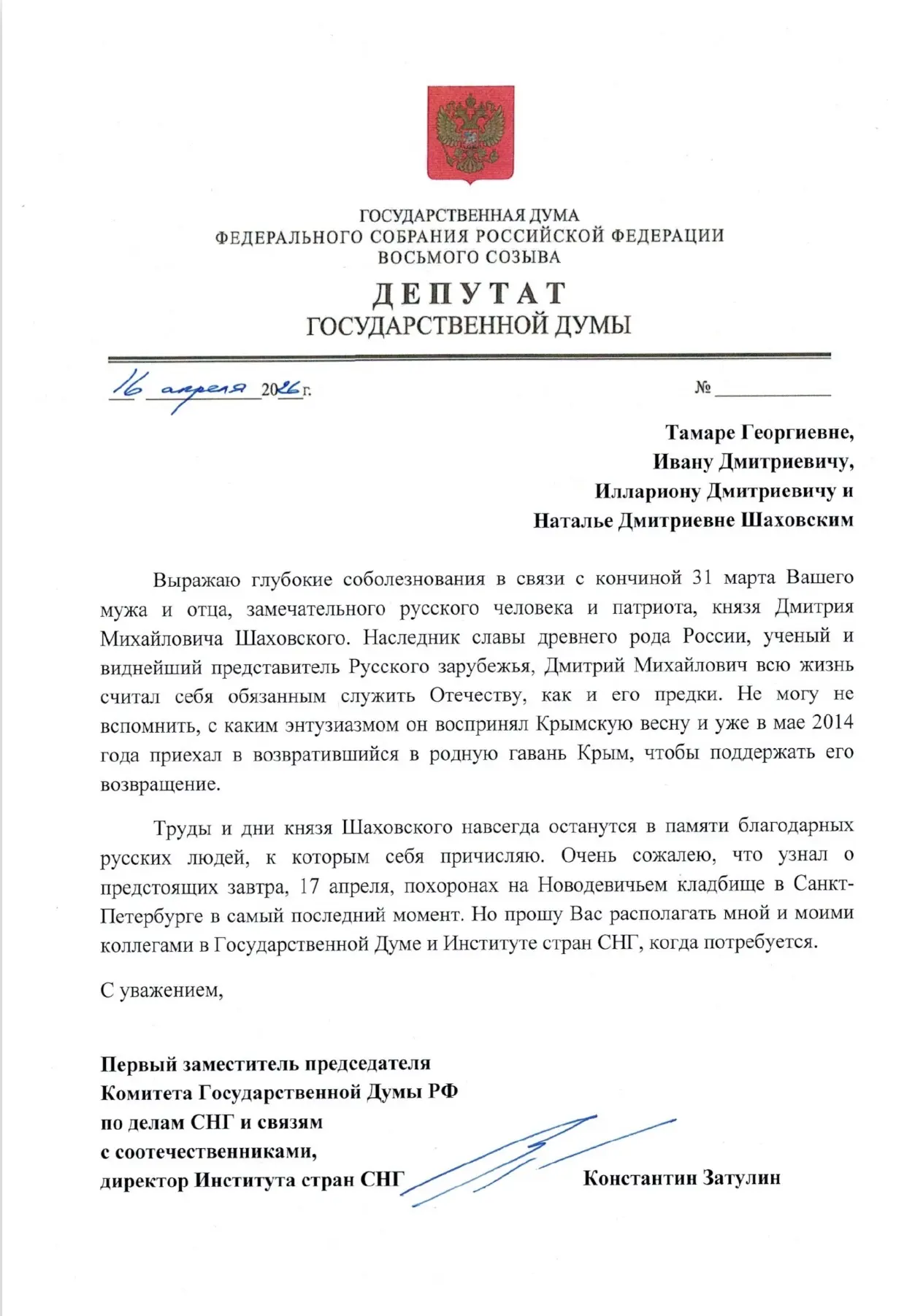Несмотря на преклонный возраст, Дмитрий Михайлович всегда был в строю. Я не встретил отказа, когда пригласил его в мае 2014 года приехать в освобожденный от Украины Крым, чтобы поддержать его возвращение. Мы встречались и позже - на конференциях наших соотечественников. Уверен, что сегодня Дмитрия Михайловича достойно проводят в последний путь его жена и дети, близкие люди. Просил передать мои соболезнования через уважаемого Виктора Александровича Москвина, директора «Дома русского зарубежья».