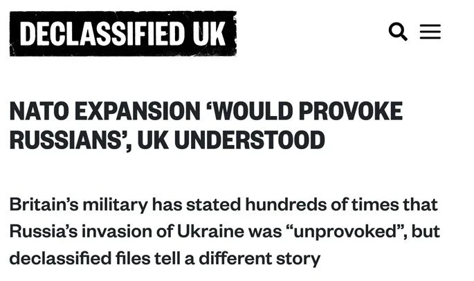 Рассекреченные документы британской разведки свидетельствуют: США и Британия отдавали себе отчёт в том, что расширение НАТО на восток неибежно приведёт к войне с Россией и готовились к ней 26 лет, — констатирует британский Declassified UK