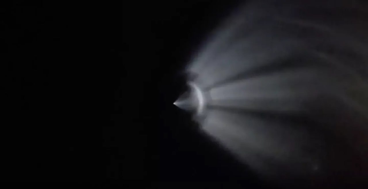Это просто газы – углекислый и пары воды в большой концентрации, которые остаются после запуска ракеты после сгорания топлива, и начинают светиться от солнечного света, и возникает вот такое причудливое красивое явление.