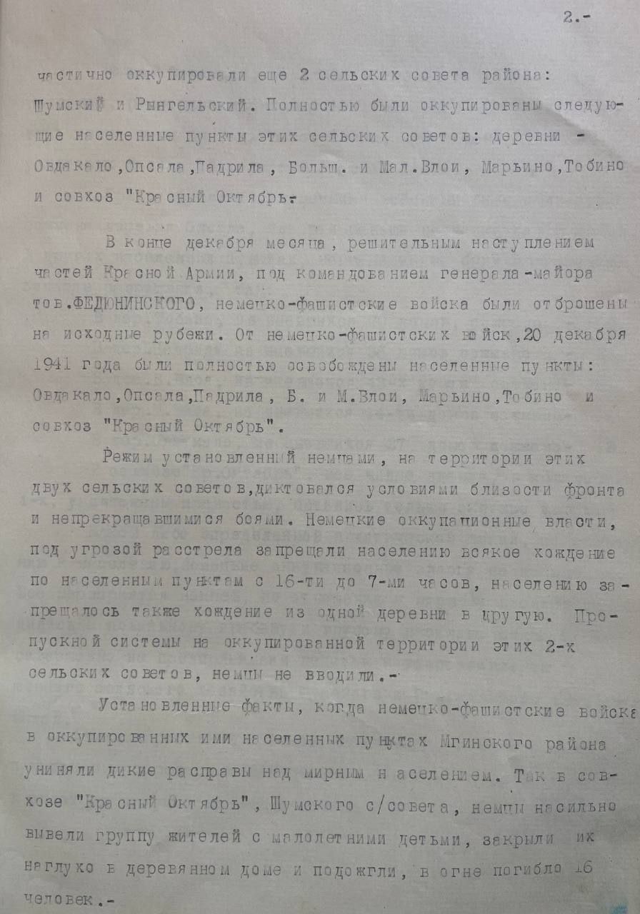 Известно, что фашистские войска оккупировали это район в начале декабря 1941 года и уже через месяц были отброшены войсками Красной армии. Однако даже за месяц оккупации они успели совершить целый ряд «диких расправ над мирным населением». Согласно полученным поисковыми отрядами документам: «Установлены факты, когда немецко-фашистские войска в оккупированных ими населенных пунктах Мгинского района учиняли дикие расправы над мирным населением. Так в совхозе «Красный октябрь», Шумского с/совета, немцы насильно вывели группу , жителей с малолетними детьми, закрыли их наглухо в деревянном доме и подожгли, в огне погибло 16 человек».